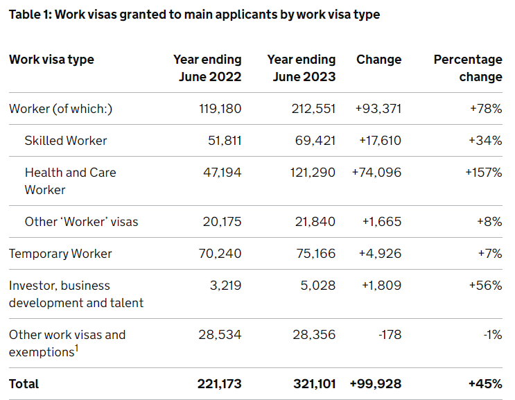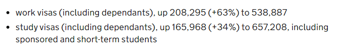 如果算上家屬,英國發放的工作類簽證甚至達到約54萬份,同比增長63%,相比2022年同期多出超20萬份。